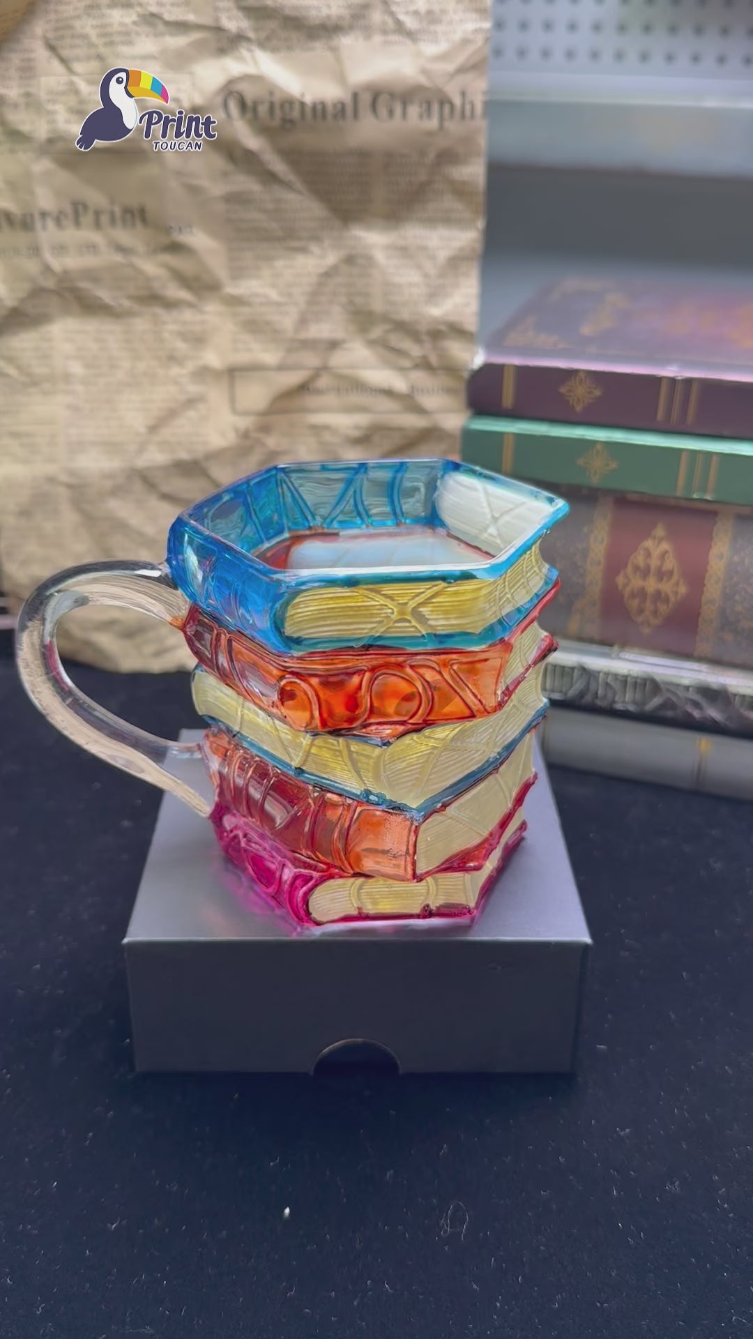 3D Painted Book Coffee Mug Glass Stained-Color Book Stack Design Literary Gift PrintToucan